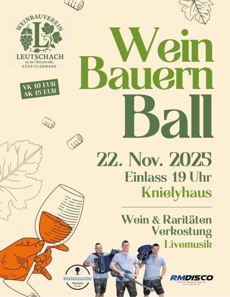 Leutschacher Weinbauernball 22. November 2025 | 19 Uhr Kniely Haus Leutschach VK 10 EuroAK (nach Verfügbarkeit) 15 Euro